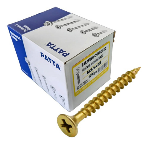 ### Parafuso Chipboard 3,5x25mm Bicromatizado – Qualidade Premium e Fixação Precisa O Parafuso Chipboard 3,5x25mm Bicromatizado da PATTA é a solução ideal para quem exige segurança, desempenho e excelência em projetos de marcenaria e montagem de móveis. Produzido em aço carbono selecionado e com acabamento bicromatizado, garante alta resistência à oxidação, durabilidade superior e fixação firme em painéis de MDF, MDP e madeiras macias. Com rosca aguda contínua e ponta agulha, proporciona penetração eficiente sem danificar a superfície, otimizando o tempo de instalação e assegurando um resultado profissional. Produto ideal para uso profissional e industrial. Embalagem com 1.000 unidades. **ATENÇÃO: QUALIDADE NÃO SE NEGOCEIA!** A PATTA é referência internacional porque entrega mais do que parafusos: entrega confiança. Todos os fixadores PATTA são NORMATIZADOS e possuem CERTIFICAÇÕES DE QUALIDADE INTERNACIONAIS, garantindo que você esteja utilizando um produto que respeita os padrões técnicos exigidos para a sua segurança e a durabilidade da sua obra. Não se arrisque com imitações ou produtos fora de norma. Não coloque sua estrutura, seu nome ou sua obra em risco. Compre produtos originais PATTA — fabricados em TAIWAN com excelência técnica, precisão industrial e controle rigoroso de qualidade. Se é para sua obra, para seu cliente e para sua tranquilidade, escolha o único com certificação garantida. **Destaques Técnicos:** Diâmetro da rosca: 3,5 mm Comprimento: 25 mm Tipo de cabeça: Chata escareada Tipo de ponta: Agulha Sistema de aperto: Phillips Nº 2 Material: Aço carbono normatizado Acabamento: Bicromatizado Aplicação: Fixação em MDF, MDP, madeira macia e aglomerado **Indicado para:** - Montagem de móveis e prateleiras - Fixação de ferragens em madeira - Marcenaria leve e projetos residenciais/comerciais - Fabricação em escala com precisão **Sobre a PATTA** Desde 1982, a PATTA International se destaca no mercado global de fixadores e ferragens. Reconhecida pelas certificações ISO 9001, ISO 14001 e TS 16949, a empresa entrega produtos com padrão internacional, fabricados exclusivamente em TAIWAN, com excelência e tecnologia de ponta. A qualidade começa no material e se comprova na sua obra. Venda para Atacado – Pronta Entrega! Produto original. Estoque imediato. Pagamento confirmado = envio rápido.