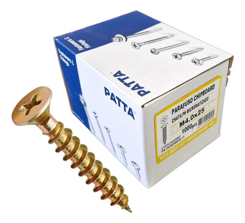Parafuso Chipboard 4,0x25mm Bicromatizado – Qualidade Premium e Fixação Precisa O Parafuso Chipboard 4,0x25mm Bicromatizado da PATTA é a solução ideal para quem exige segurança, desempenho e excelência em projetos de marcenaria e montagem de móveis. Produzido em aço carbono selecionado e com acabamento bicromatizado, garante alta resistência à oxidação, durabilidade superior e fixação firme em painéis de MDF, MDP e madeiras macias. Com rosca aguda contínua e ponta agulha, proporciona penetração eficiente sem danificar a superfície, otimizando o tempo de instalação e assegurando um resultado profissional. Produto ideal para uso profissional e industrial. Embalagem com 1.000 unidades. ATENÇÃO: QUALIDADE NÃO SE NEGOCEIA! A PATTA é referência internacional porque entrega mais do que parafusos: entrega confiança. Todos os fixadores PATTA são NORMATIZADOS e possuem CERTIFICAÇÕES DE QUALIDADE INTERNACIONAIS, garantindo que você esteja utilizando um produto que respeita os padrões técnicos exigidos para a sua segurança e a durabilidade da sua obra. Não se arrisque com imitações ou produtos fora de norma. Não coloque sua estrutura, seu nome ou sua obra em risco. Compre produtos originais PATTA — fabricados em TAIWAN com excelência técnica, precisão industrial e controle rigoroso de qualidade. Se é para sua obra, para seu cliente e para sua tranquilidade, escolha o único com certificação garantida. Destaques Técnicos: Diâmetro da rosca: 4.0 mm Comprimento: 25mm Tipo de cabeça: Chata escareada Tipo de ponta: Agulha Sistema de aperto: Phillips Nº 2 Material: Aço carbono normatizado Acabamento: Bicromatizado Aplicação: Fixação em MDF, MDP, madeira macia e aglomerado Indicado para: - Montagem de móveis e prateleiras - Fixação de ferragens em madeira - Marcenaria leve e projetos residenciais/comerciais - Fabricação em escala com precisão Superfícies Recomendadas: - MDF e MDP - Aglomerado - Compensado - Madeiras macias em geral - Painéis de partículas Sobre a PATTA Desde 1982, a PATTA International se destaca no mercado global de fixadores e ferragens. Reconhecida pelas certificações ISO 9001, ISO 14001 e TS 16949, a empresa entrega produtos com padrão internacional, fabricados exclusivamente em TAIWAN, com excelência e tecnologia de ponta. A qualidade começa no material e se comprova na sua obra. Venda para Atacado – Pronta Entrega! Produto original. Estoque imediato. Pagamento confirmado = envio rápido.