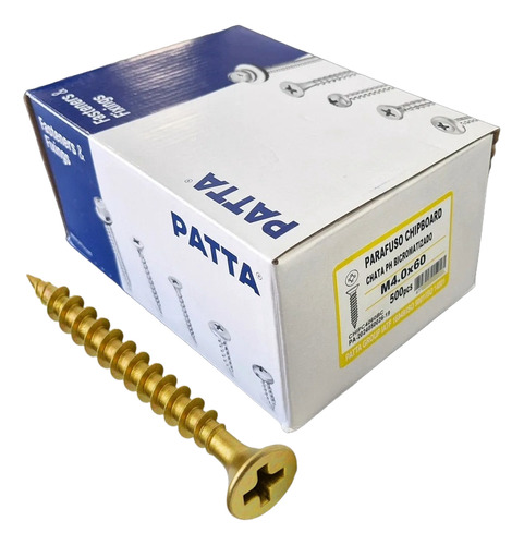 Parafuso Chipboard 4,0x60mm Bicromatizado – Qualidade Premium e Fixação Precisa O Parafuso Chipboard 4,0x60mm Bicromatizado da PATTA é a solução ideal para quem exige segurança, desempenho e excelência em projetos de marcenaria e montagem de móveis. Produzido em aço carbono selecionado e com acabamento bicromatizado, garante alta resistência à oxidação, durabilidade superior e fixação firme em painéis de MDF, MDP e madeiras macias. Com rosca aguda contínua e ponta agulha, proporciona penetração eficiente sem danificar a superfície, otimizando o tempo de instalação e assegurando um resultado profissional. Produto ideal para uso profissional e industrial. Embalagem com 500 unidades. ATENÇÃO: QUALIDADE NÃO SE NEGOCEIA! A PATTA é referência internacional porque entrega mais do que parafusos: entrega confiança. Todos os fixadores PATTA são NORMATIZADOS e possuem CERTIFICAÇÕES DE QUALIDADE INTERNACIONAIS, garantindo que você esteja utilizando um produto que respeita os padrões técnicos exigidos para a sua segurança e a durabilidade da sua obra. Não se arrisque com imitações ou produtos fora de norma. Não coloque sua estrutura, seu nome ou sua obra em risco. Compre produtos originais PATTA — fabricados em TAIWAN com excelência técnica, precisão industrial e controle rigoroso de qualidade. Se é para sua obra, para seu cliente e para sua tranquilidade, escolha o único com certificação garantida. Destaques Técnicos: Diâmetro da rosca: 4.0 mm Comprimento: 60mm Tipo de cabeça: Chata escareada Tipo de ponta: Agulha Sistema de aperto: Phillips Nº 2 Material: Aço carbono normatizado Acabamento: Bicromatizado Aplicação: Fixação em MDF, MDP, madeira macia e aglomerado Indicado para: - Montagem de móveis e prateleiras - Fixação de ferragens em madeira - Marcenaria leve e projetos residenciais/comerciais - Fabricação em escala com precisão Superfícies Recomendadas: - MDF e MDP - Aglomerado - Compensado - Madeiras macias em geral - Painéis de partículas Sobre a PATTA Desde 1982, a PATTA International se destaca no mercado global de fixadores e ferragens. Reconhecida pelas certificações ISO 9001, ISO 14001 e TS 16949, a empresa entrega produtos com padrão internacional, fabricados exclusivamente em TAIWAN, com excelência e tecnologia de ponta. A qualidade começa no material e se comprova na sua obra. Venda para Atacado – Pronta Entrega! Produto original. Estoque imediato. Pagamento confirmado = envio rápido.