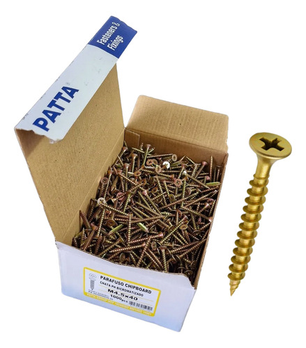 Parafuso Chipboard 4,5x40mm Bicromatizado – Qualidade Premium e Fixação Precisa O Parafuso Chipboard 4,5x40mm Bicromatizado da PATTA é a solução ideal para quem exige segurança, desempenho e excelência em projetos de marcenaria e montagem de móveis. Produzido em aço carbono selecionado e com acabamento bicromatizado, garante alta resistência à oxidação, durabilidade superior e fixação firme em painéis de MDF, MDP e madeiras macias. Com rosca aguda contínua e ponta agulha, proporciona penetração eficiente sem danificar a superfície, otimizando o tempo de instalação e assegurando um resultado profissional. Produto ideal para uso profissional e industrial. Embalagem com 1.000 unidades. ATENÇÃO: QUALIDADE NÃO SE NEGOCEIA! A PATTA é referência internacional porque entrega mais do que parafusos: entrega confiança. Todos os fixadores PATTA são NORMATIZADOS e possuem CERTIFICAÇÕES DE QUALIDADE INTERNACIONAIS, garantindo que você esteja utilizando um produto que respeita os padrões técnicos exigidos para a sua segurança e a durabilidade da sua obra. Não se arrisque com imitações ou produtos fora de norma. Não coloque sua estrutura, seu nome ou sua obra em risco. Compre produtos originais PATTA — fabricados em TAIWAN com excelência técnica, precisão industrial e controle rigoroso de qualidade. Se é para sua obra, para seu cliente e para sua tranquilidade, escolha o único com certificação garantida. Destaques Técnicos: Diâmetro da rosca: 4.5 mm Comprimento: 40mm Tipo de cabeça: Chata escareada Tipo de ponta: Agulha Sistema de aperto: Phillips Nº 2 Material: Aço carbono normatizado Acabamento: Bicromatizado Aplicação: Fixação em MDF, MDP, madeira macia e aglomerado Indicado para: - Montagem de móveis e prateleiras - Fixação de ferragens em madeira - Marcenaria leve e projetos residenciais/comerciais - Fabricação em escala com precisão Superfícies Recomendadas: - MDF e MDP - Aglomerado - Compensado - Madeiras macias em geral - Painéis de partículas Sobre a PATTA Desde 1982, a PATTA International se destaca no mercado global de fixadores e ferragens. Reconhecida pelas certificações ISO 9001, ISO 14001 e TS 16949, a empresa entrega produtos com padrão internacional, fabricados exclusivamente em TAIWAN, com excelência e tecnologia de ponta. A qualidade começa no material e se comprova na sua obra. Venda para Atacado – Pronta Entrega! Produto original. Estoque imediato. Pagamento confirmado = envio rápido.
